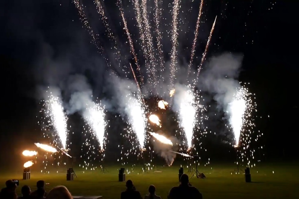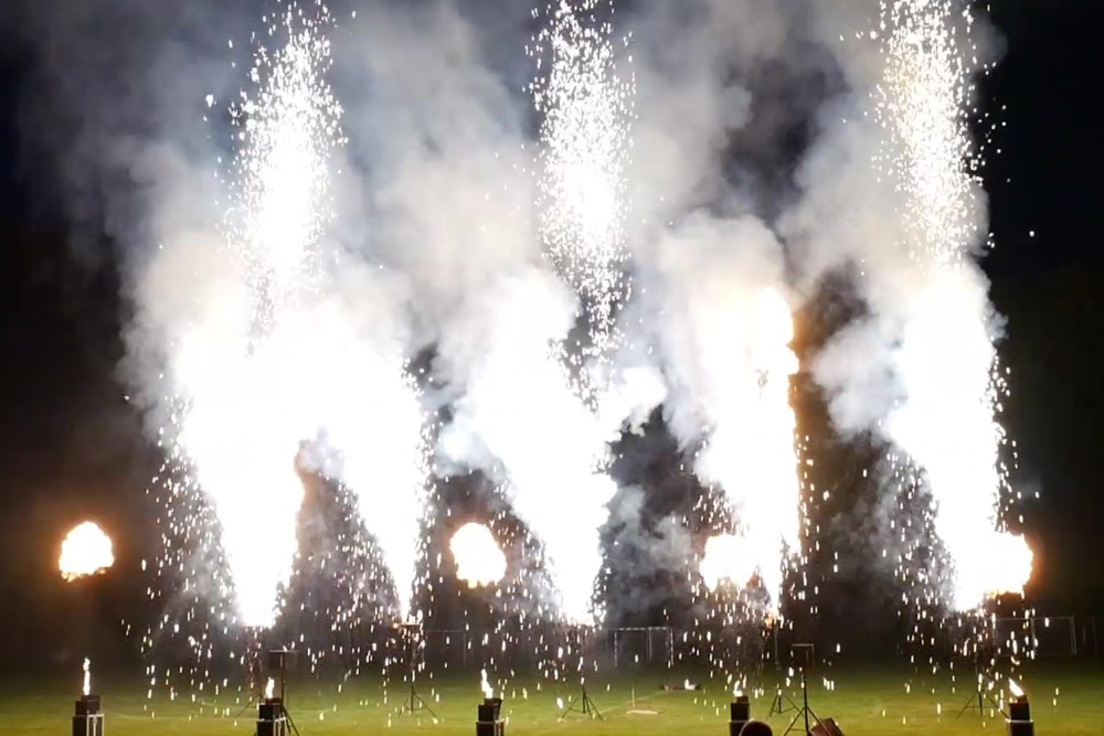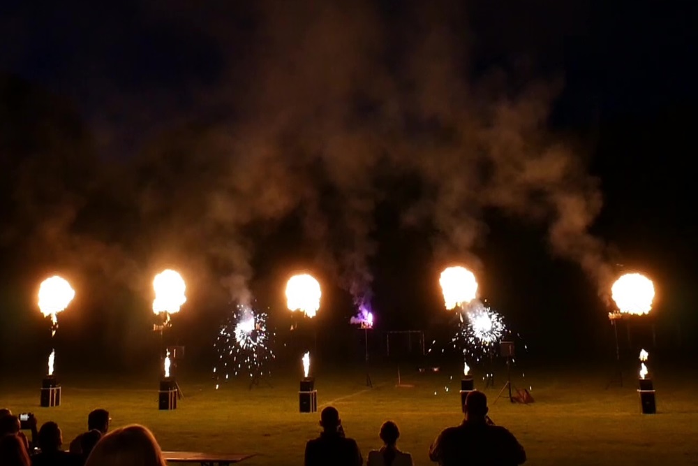 Taktgenau zur Musik erhellen Flammenbälle den Nachthimmel, ergänzt von unseren Waveflamern mit schwenkbarer Flamme. Hiermit lassen sich völlig gefahrlos Feuereffekte in verschiedenen Winkeln erzeugen, die Flammenhöhe beträgt ca. 8 Meter. Für die Zuschauer eines solchen Nahbereichsfeuerwerks ein eindrucksvolles Erlebnis, da die Wärmenetwicklung deutlich spürbar ist.