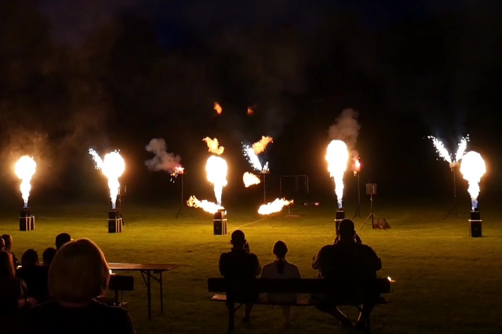 Flammenshow, kombiniert mit Pyrotechnik, anlässlich einer Geburtstagsfeier am 15.06.2019 in Bruchköbel (in der Nähe von Hanau im Main-Kinzig-Kreis).